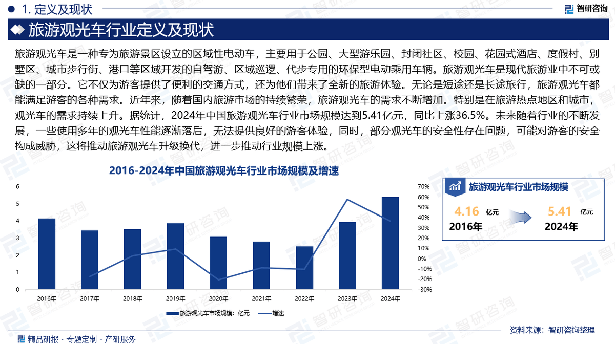 旅逛参不雅车是现代旅逛业中不成或缺的一部门。它不只为旅客供给了便当的交通体例,还为他们带来了全新的旅逛体验。无论是短途仍是长途旅行,旅逛参不雅车都能满脚旅客的各类需求。近年来,跟着国内旅逛市场的持续繁荣,旅逛参不雅车的需求不竭添加。出格是正在旅逛热点地域和城市,参不雅车的需求持续上升。据统计,2024年中国旅逛参不雅车行业市场规模达到5。41亿元,同比上涨36。5%。将来跟着行业的不竭成长,一些利用多年的参不雅车机能逐步掉队,无法供给优良的旅客体验,同时,部门参不雅车的平安性存正在问题,可能对旅客的平安形成,这将鞭策旅逛参不雅车升级换代,进一步鞭策行业规模上涨。