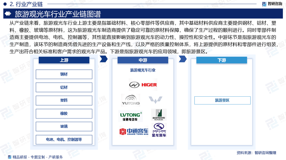 从财产链来看,旅逛参不雅车行业上逛次要是指根本材料、焦点零部件等供应商,此中根本材料供应商次要供给钢材、铝材、塑料、橡胶、玻璃等原材料,这为旅逛参不雅车制制商供给了不变靠得住的原材料保障,确保了出产过程的成功进行。同时零部件制制商次要供给电池、电机、节制器等,其机能间接影响到旅逛参不雅车的动力性、操控性和平安性。中逛环节是指旅逛参不雅车的出产制制,该环节的制制商凭仗先辈的出产设备和出产线,以及严酷的质量节制系统,将上逛供给的原材料和零部件进行拆卸,出产出合适相关尺度和客户需求的参不雅车产物。下逛是指旅逛参不雅车的使用范畴,即旅逛景区。