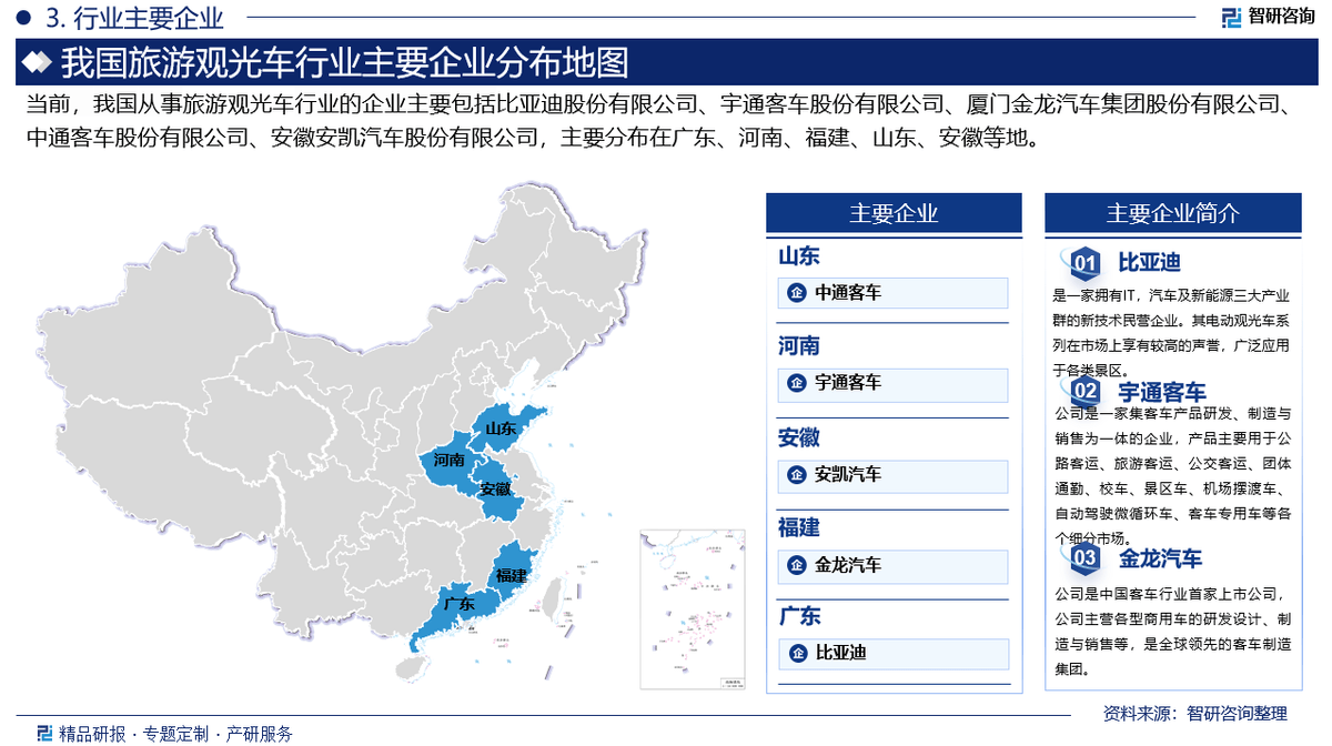 目前,中国旅逛参不雅车市场呈现出多元化合作的款式。国内出名的汽车制制商和专业的参不雅车制制商是市场的次要参取者,这些企业通过手艺立异和质量提拔,不竭巩固和扩大市场份额。同时,一些新兴的参不雅车企业也正在快速兴起,通过供给更具立异性和个性化的产物,逐步博得市场承认。目前,行业内相关企业次要包罗比亚迪股份无限公司、宇通客车股份无限公司、厦门金龙汽车集团股份无限公司、中通客车股份无限公司、安徽安凯汽车股份无限公司,次要分布正在广东、河南、福建、山东、安徽等地。